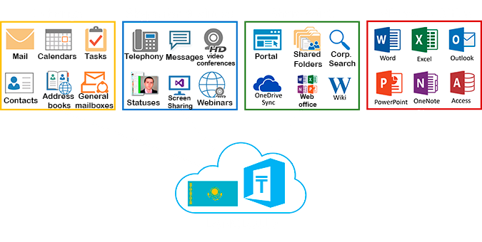 Cloud Office is a ready-made package of cloud SaaS services: email based on Microsoft Exchange, collaborative document work powered by SharePoint, communication tools, video conferencing and IP telephony based on Skype for Business, as well as the Microsoft 365 Apps for Business suite. Unlike Microsoft 365 online services, Cloud Office is hosted in the Republic of Kazakhstan. Payment for Cloud Office, similar to Office 365, is made per user. The number of users can be adjusted monthly — both increased or decreased.