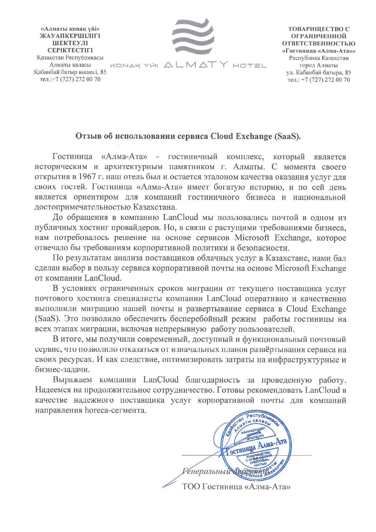 After analyzing cloud service providers in Kazakhstan, we chose LanCloud's Microsoft Exchange-based corporate email service.With a limited timeframe for migration from our current email hosting provider, LanCloud's specialists quickly and efficiently migrated our email and deployed the service to Cloud Exchange (SaaS). This ensured the hotel's uninterrupted operation throughout all stages of the migration, including uninterrupted user experience